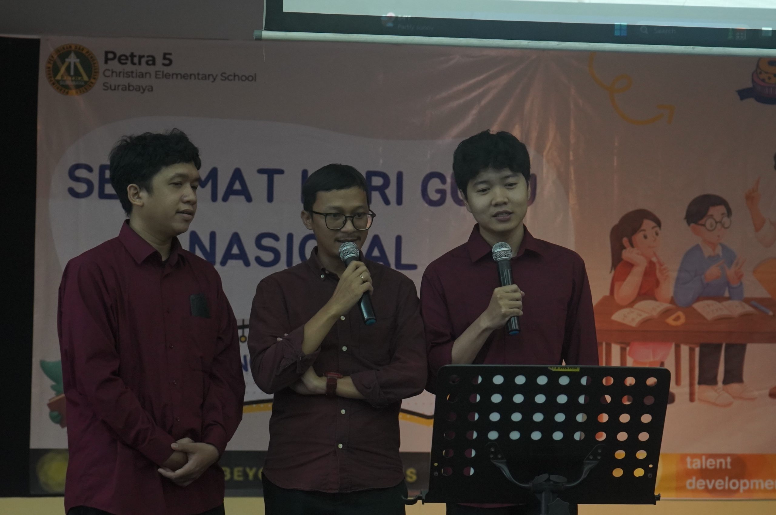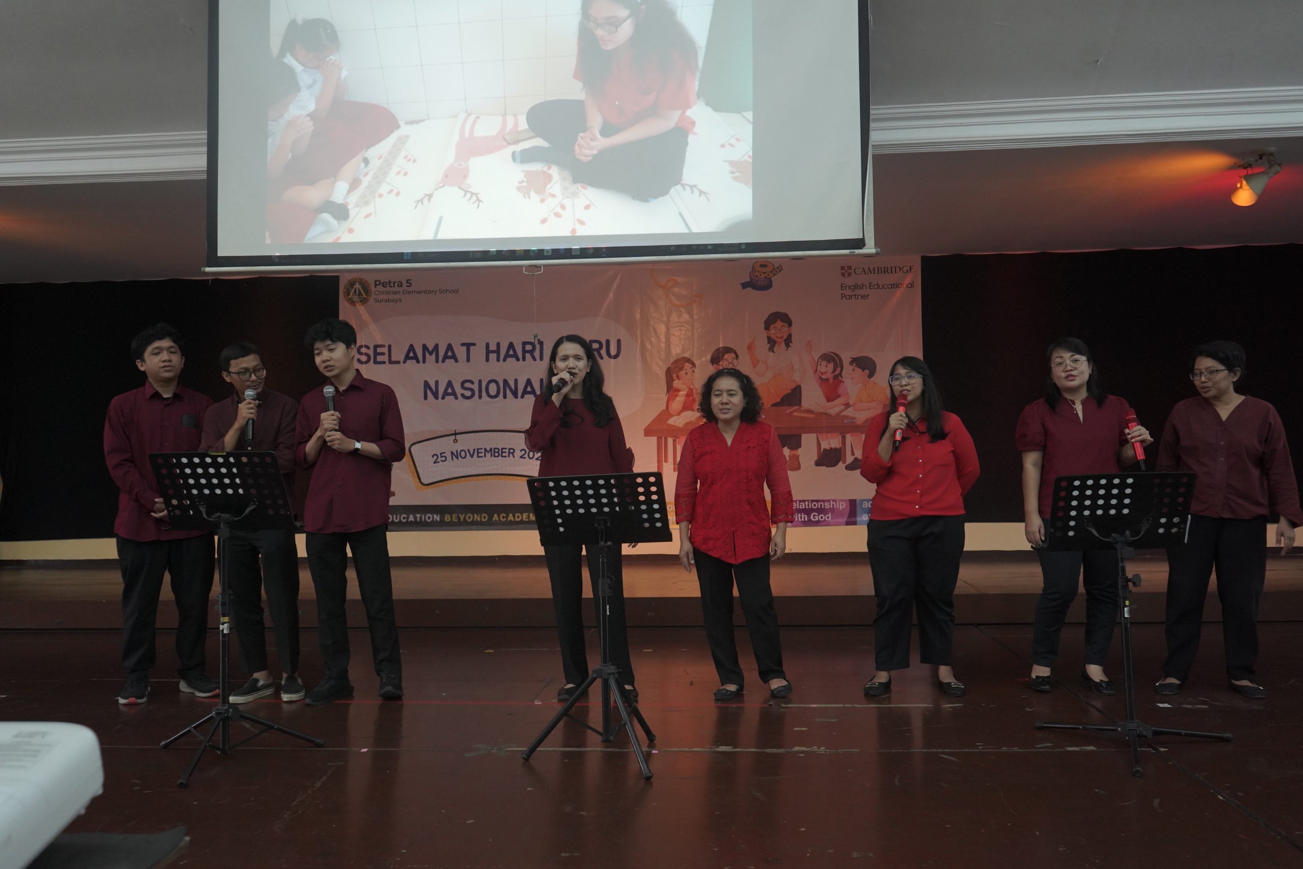 Pada tanggal 25 November 2025 lalu, kami juga memperingati Hari Guru Nasional. Suasana peringatan Hari Guru berlangsung dengan penuh rasa syukur. Siswa SD Kristen Petra 5 memberikan persembahan kepada bapak dan ibu guru melalui lantunan puisi penuh makna, melodi lagu yang mengharu, serta pelukan hangat bagi sang guru. Kepala sekolah pun turut serta menyanyikan single “You Raise Me Up” bersama tim ensambel sebagai bentuk apresiasi kepada guru-guru SD Kristen Petra 5 yang sudah memberikan waktu, tenaga, dan pikirannya, dalam menuntun perjalanan studi para anak didiknya.
