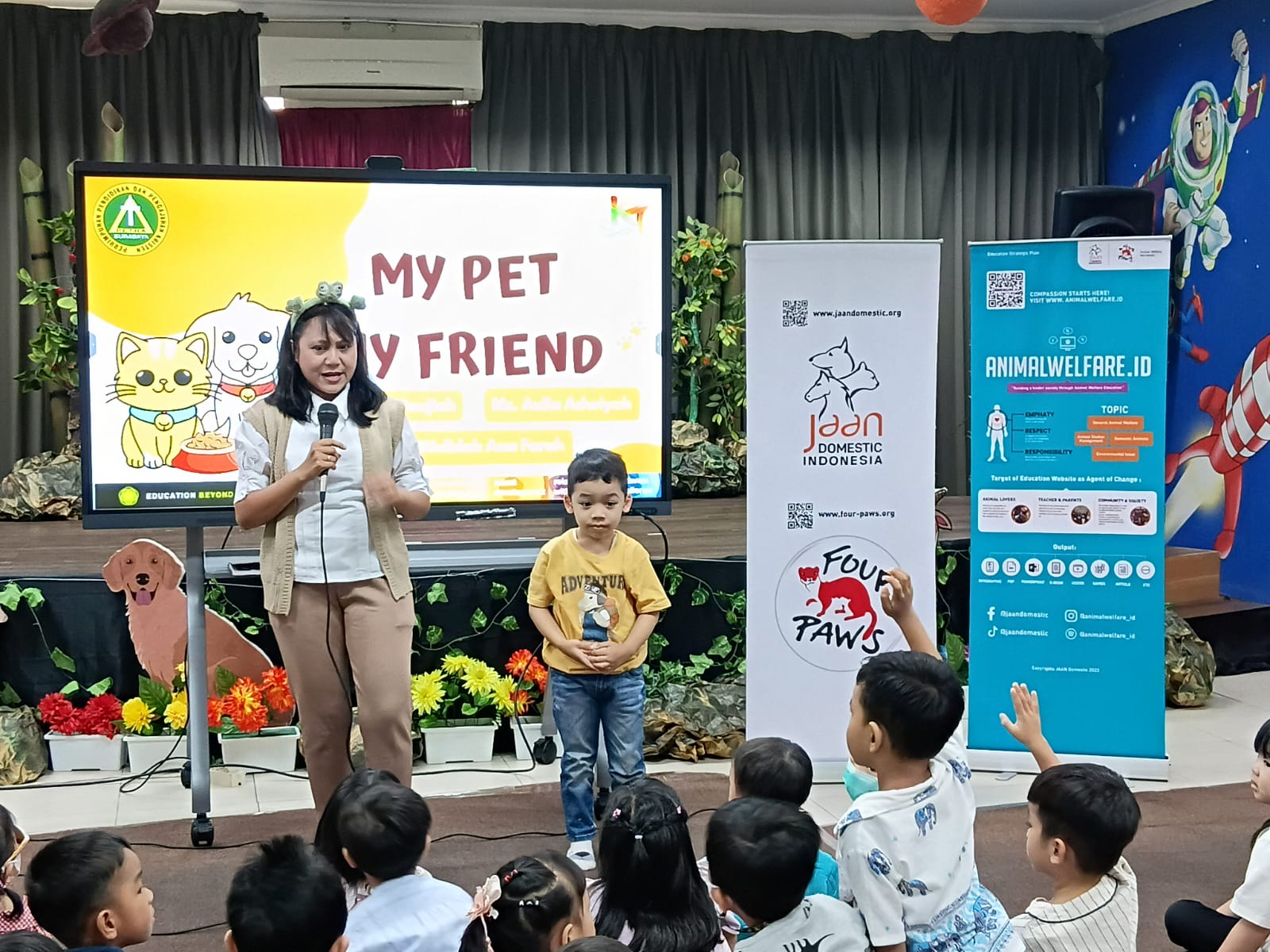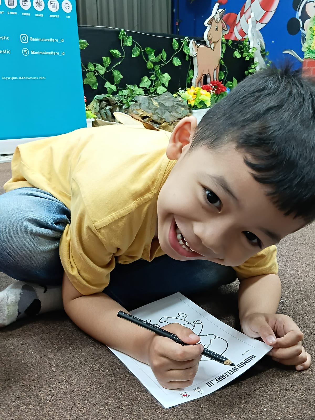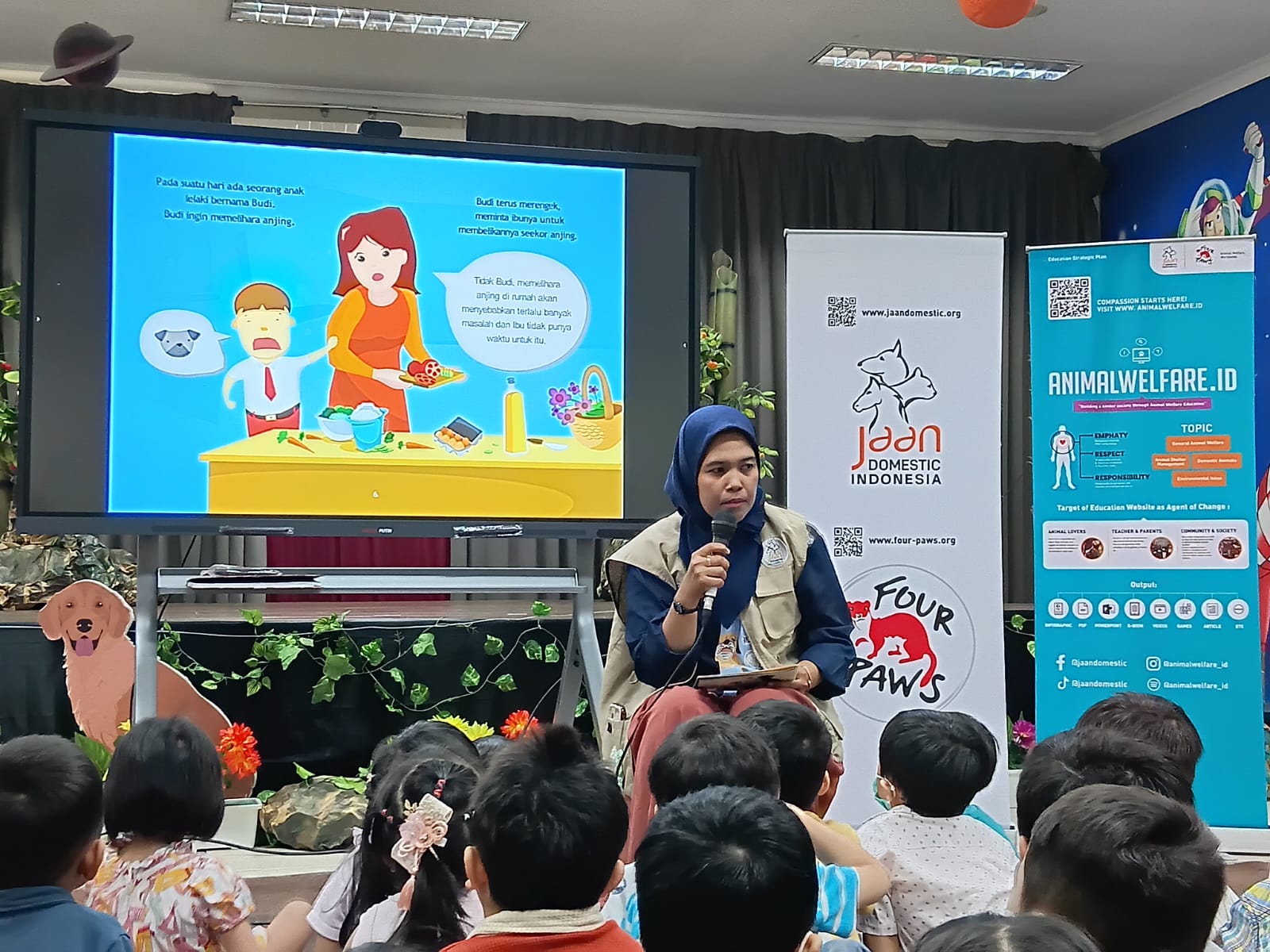 Pada kegiatan ini kami juga kedatangan tamu istimewa dari Animalwelfare.id. Animalwelfare.id adalah sebuah organisasi yang bertugas memberikan edukasi dan sumber daya kesejahteraan hewan di Indonesia yang mendukung penyebaran kesadaran dan pembelajaran tentang hak-hak serta perlakuan baik terhadap hewan. Kami bertemu kakak-kakak dan dokter hewan dari Animalwelfare.id – Yayasan JAAN Indonesia. Ada drh. Mike, Ms. Aulia, dan Ms. Walidah. Mereka baik sekali dan bercerita tentang hewan dengan cara yang menyenangkan.