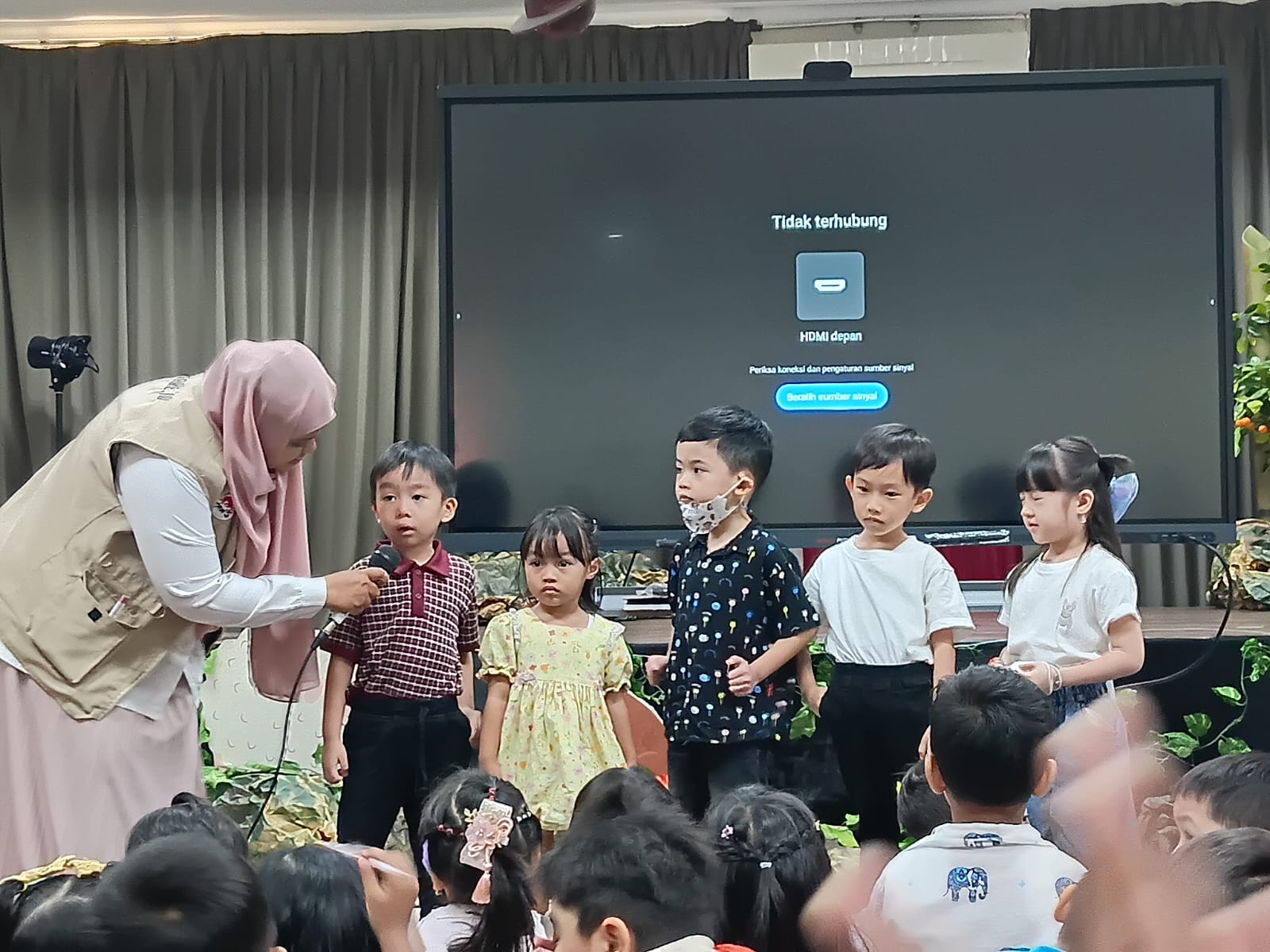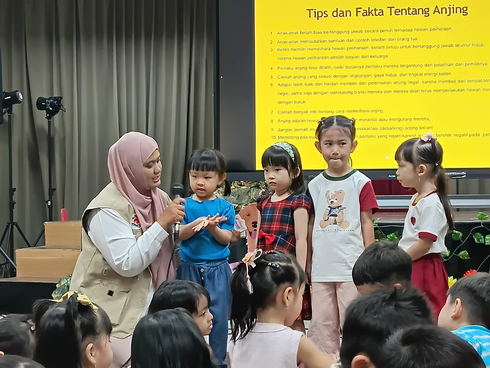 Kegiatannya dimulai dengan ice breaking. Kami tertawa, tepuk tangan, dan menjadi semangat. Setelah itu, kami bernyanyi dan bergerak bersama lagu “Walking in the Jungle.” Kami berjalan seperti di hutan dan menirukan gerakan hewan. Seru banget! Kami juga mendengarkan cerita dari drh. Mike tentang anjing “Menjadi Pemilik Anjing yang Bertanggung Jawab”. Ceritanya membuat kami tahu kalau hewan bisa menjadi sahabat yang setia dan harus disayang, tidak boleh disakiti.