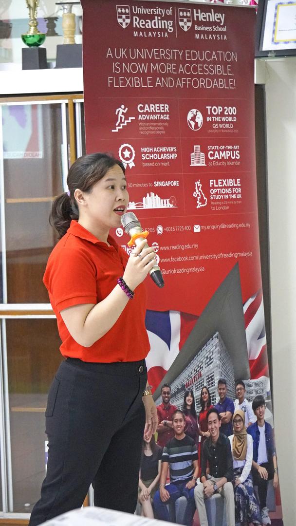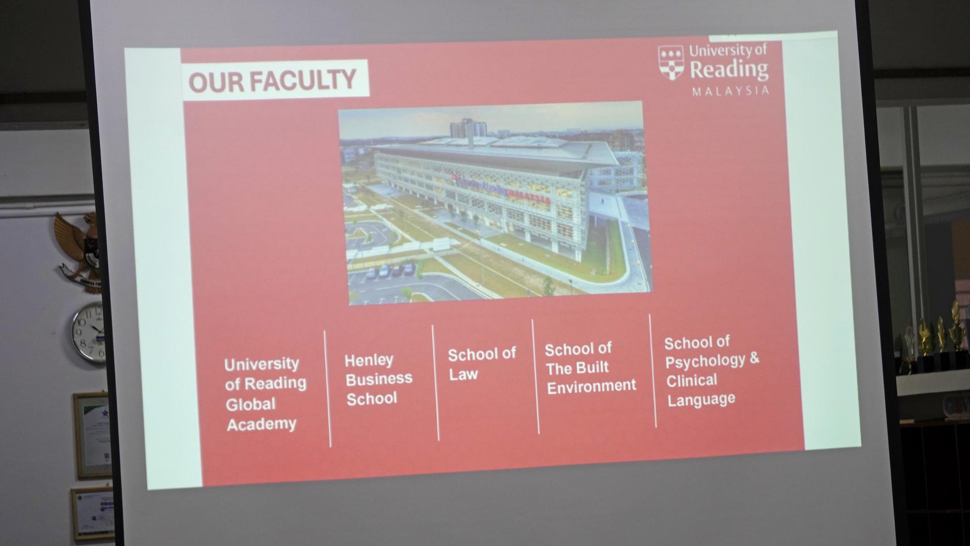 Dalam kesempatan tersebut, para siswa diperkenalkan dengan profil University of Reading yang berpusat di Inggris, sekaligus international branch campus miliknya di Malaysia. Di depan para, Ms. Mell Yap memaparkan berbagai pilihan bidang jurusan yang tersedia, mulai dari bidang bisnis, hukum, hingga sains. Penjelasan ini memberi gambaran lebih luas mengenai peluang studi internasional yang dapat diakses dengan lebih fleksibel oleh siswa-siswi khususnya di Asia Tenggara.
