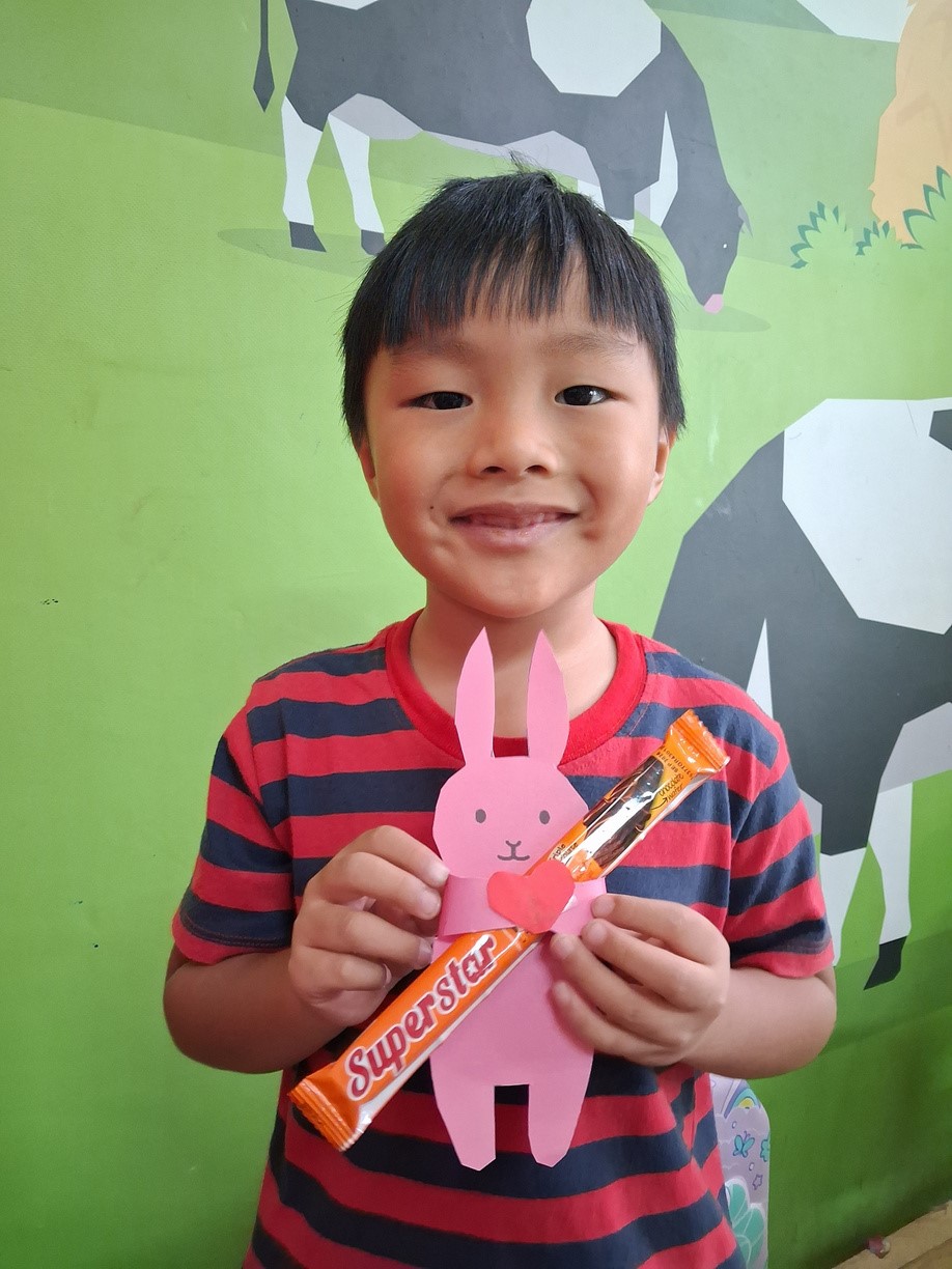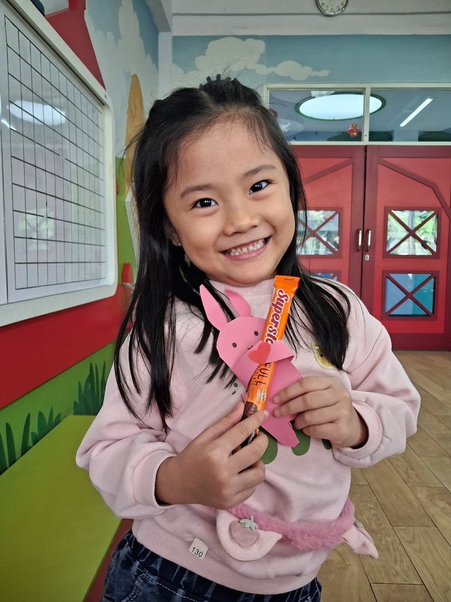 Meanwhile, Kindergarten B students were equally creative. They made heart-shaped crafts sweetly decorated with candies in the center. They also created adorable bunny crafts holding chocolates. These creations showed just how eager the children were to give a special surprise to their moms and dads.
