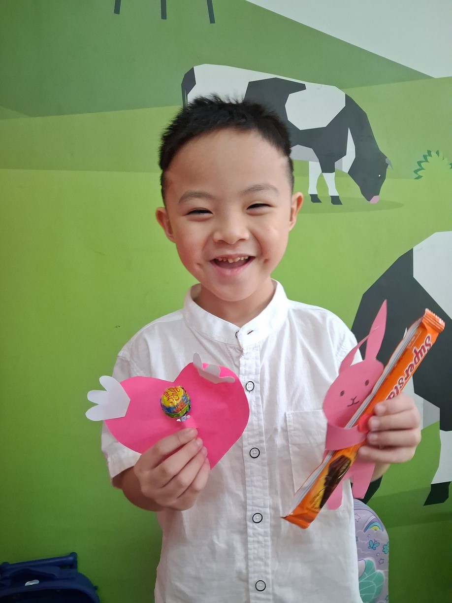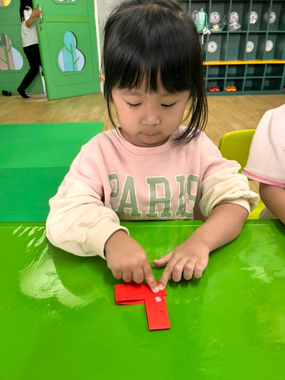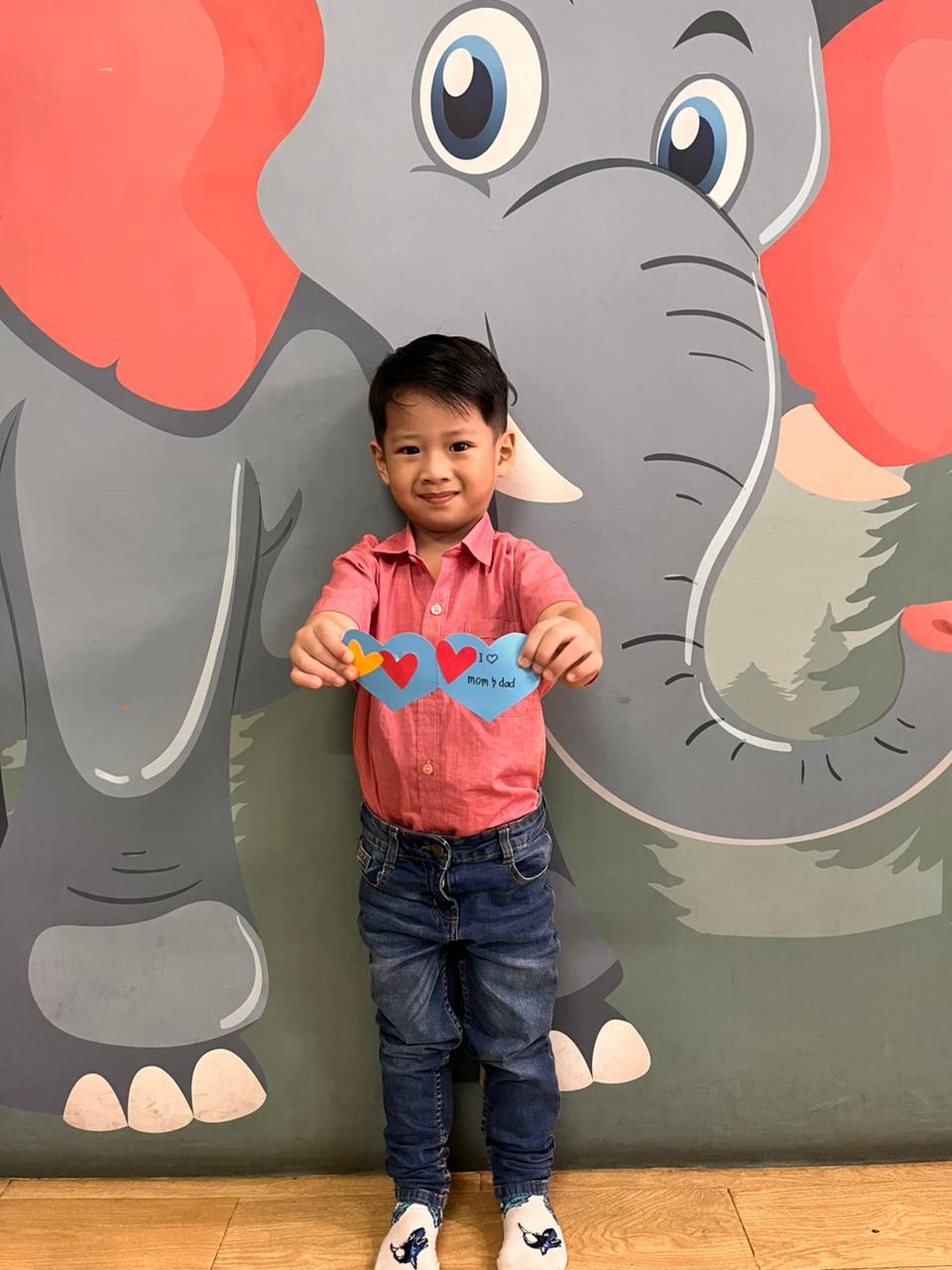 The students of Playgroup A painted heart shapes in pink, which helped them develop their fine motor skills. Meanwhile, Playgroup B created heart-shaped flowers using popsicle sticks and origami paper, carefully arranging and assembling each piece. Through these activities, students learned to develop their creativity, patience, and hand–eye coordination in a cheerful and enthusiastic atmosphere.