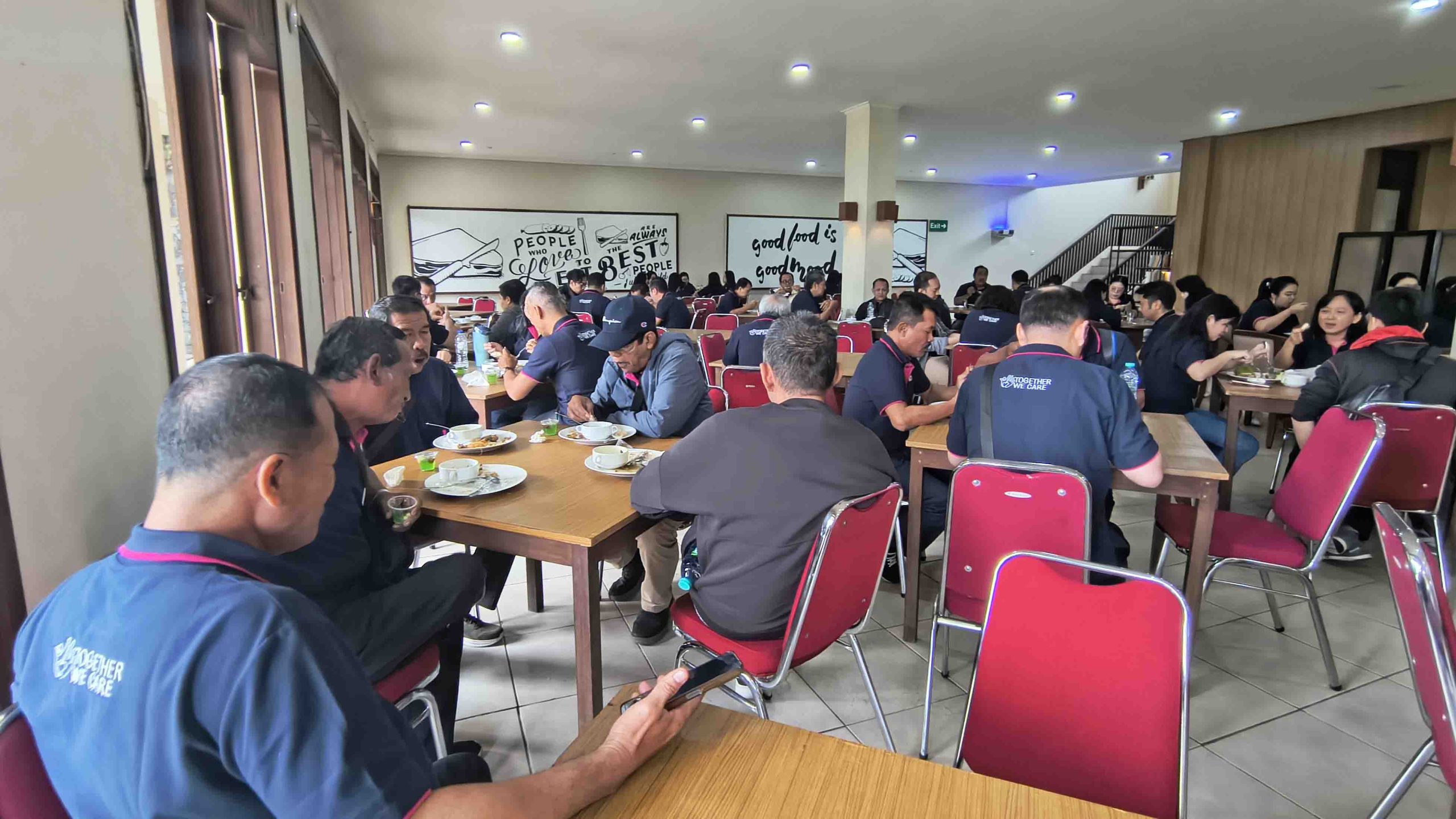 Perjalanan darat menuju Salatiga berlangsung dalam suasana kekeluargaan. Tepat pukul 11.30 WIB, ketiga bus tiba di D’emmerick Salib Putih Hotel, Salatiga. Udara pegunungan yang segar menyambut para peserta, seolah menjadi penanda dimulainya proses penyegaran jiwa. Sebelum memasuki agenda formal, seluruh peserta melakukan sesi foto bersama di area terbuka hotel sebagai simbol kesatuan hati, yang kemudian dilanjutkan dengan makan siang bersama untuk mempererat relasi antarstaf.