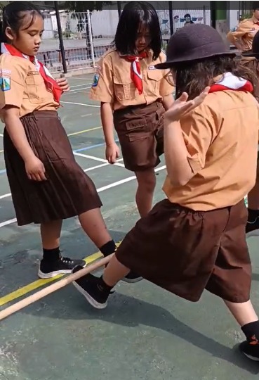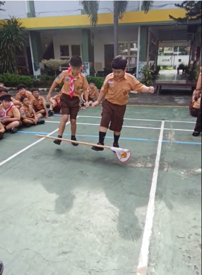 “Kalian harus membawa tongkat ini berpasangan, dan hanya boleh menggunakan satu kaki!” jelas Kakak Pembina. “Caranya, kalian berpasangan, lalu tongkat diletakan di atas punggung kaki kalian. Hanya satu kaki yang diangkat, lalu kalian harus melompat-lompat bersama menuju garis akhir!”