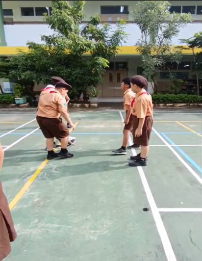 Kegiatan Pramuka selalu menjadi salah satu kegiatan yang paling kami tunggu di sekolah. Pada kegiatan Pramuka kali ini, siswa kelas 4 mendapatkan pengalaman yang sangat seru dan menantang. Kami belajar sandi Merah Putih, yaitu sandi rahasia yang sering digunakan dalam kegiatan kepramukaan. Sebelum memecahkan sandi, kami harus menyelesaikan sebuah tantangan terlebih dahulu. Tantangan tersebut bernama “Estafet Tongkat.” Tantangan ini cukup unik karena kami tidak boleh memindahkan tongkat dengan tangan, melainkan dengan satu kaki. Kami harus bekerja berpasangan dengan teman satu regu. Dalam permainan ini kami harus saling membantu dan menjaga keseimbangan agar tidak terjatuh. Jika tidak kompak, tongkat bisa jatuh dan kami harus mengulang kembali. Karena itu, kerja sama dan kekompakan sangat diperlukan. Walaupun terasa sulit pada awalnya, kami tetap berusaha dengan semangat. Kami saling memberi semangat kepada teman satu tim agar bisa menyelesaikan tantangan dengan baik. Ketika akhirnya kami berhasil menyelesaikan estafet tongkat, rasanya sangat menyenangkan.