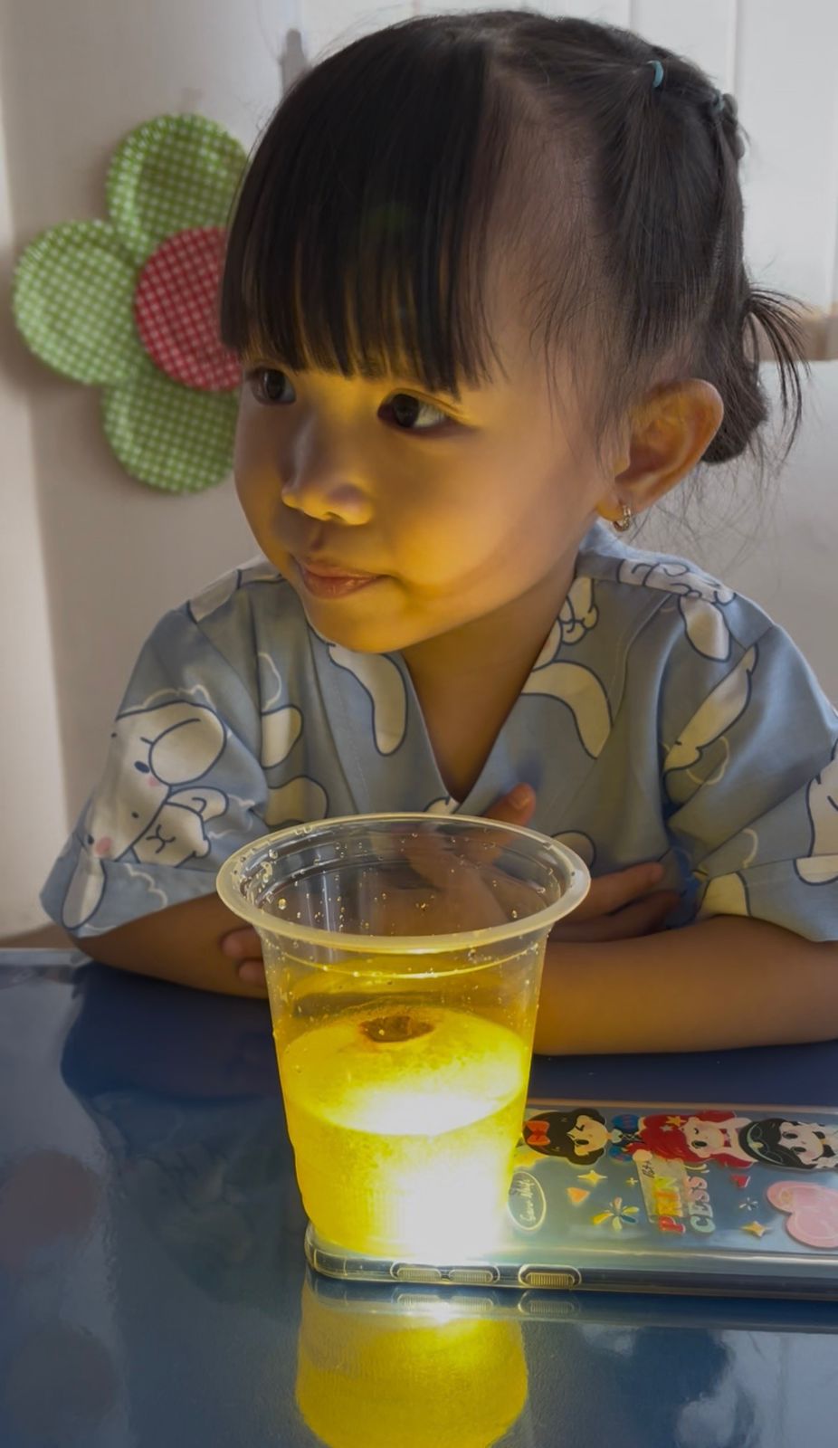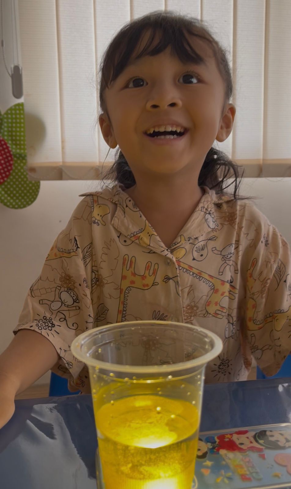 Keseruan berlanjut dengan eksperimen “Magic Pixy Dust”. Hanya dengan menggunakan gelas transparan, air, bubuk kunyit, dan bantuan cahaya senter ponsel, anak-anak diajak melihat keajaiban cahaya di dalam kegelapan. Mata mereka berbinar penuh rasa takjub saat melihat butiran-butiran “serbuk ajaib” itu perlahan larut dan berubah warna ketika terkena cahaya. Melalui kegiatan sederhana ini, mereka belajar memahami betapa indahnya cahaya yang Tuhan ciptakan untuk menerangi dunia.
