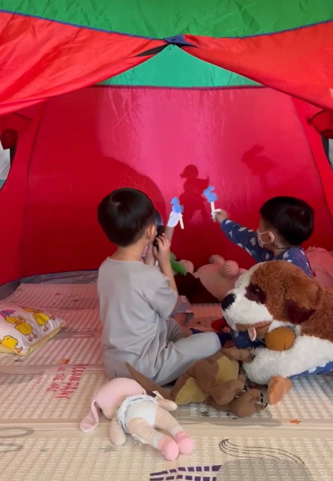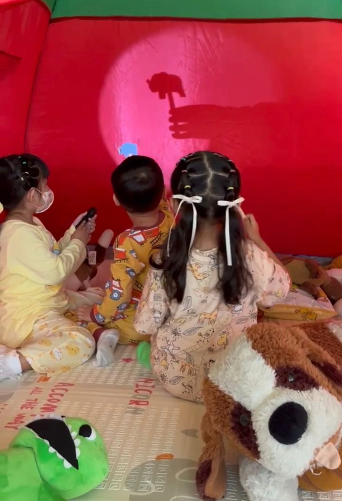 Kegiatan semakin seru….. saat anak-anak masuk ke dalam tenda secara berkelompok. Mereka asyik bermain bayangan! Dengan cahaya lampu senter, anak-anak belajar bagaimana bayangan terbentuk. Tawa yang lepas terdengar saat mereka berhasil membuat bentuk-bentuk lucu dan saling menebak bayangan siapa yang sedang menari di dinding tenda.